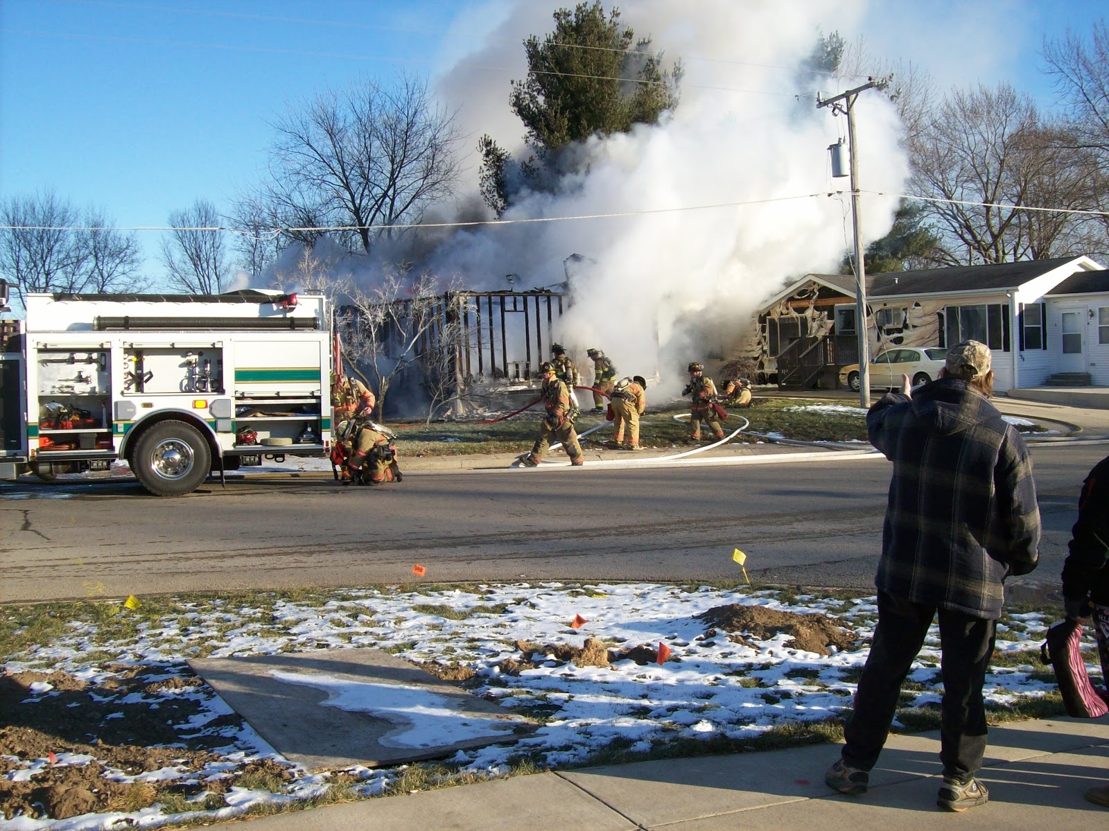 The owner was pulled out of the without shoes or a shirt let alone a coat. He is fine. He lost everything. The house behind them or to the right lost all the siding on the house and it melted the car bumper and front quarter panel. They were on the scene for 4 hours and 6 fire departments were hauling water. We live on a well and as many will know not the best water pressure. So water had to be hauled to a slurry tank to be pumped onto the fire.